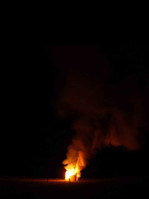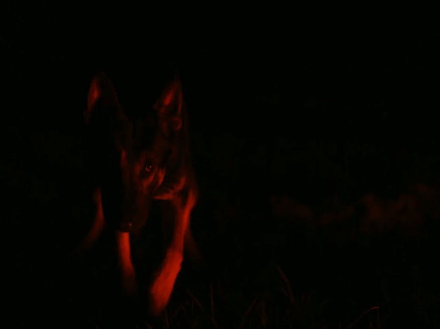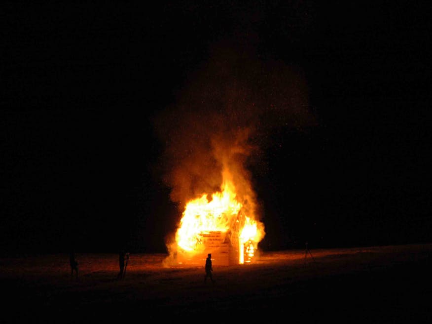 In a fantastic scenario, a dog watches a house fire from far away. Perhaps the dog had come to seek its shelter, perhaps he knew that place to be inhabited by human beings from which he could have taken refuge. It is night time and the fire is great, the flames completely envelop the house and what is contained, the men have fled and the dog is still observing the metamorphosis of the fire. The images of the video are created on a loop that gives the illusion, together with the soundscape of a longer duration, of being in front of perpetual fire. The house remains in an unreal suspension between the flames and the domesticated animal is in a state of broken dependence.